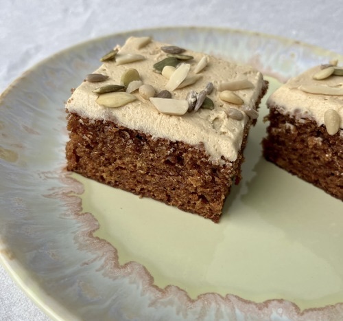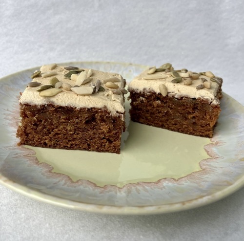Ingrediënten: tarwebloem, suiker, kokosolie, zonnebloemolie, sojamelk, wortel, azijn, pijnboompitten, amandel, maïszetmeel, pompoenpitten, zonnebloempitten, margarine, zuiveringszout, zout, vanillesuiker, poedersuiker.